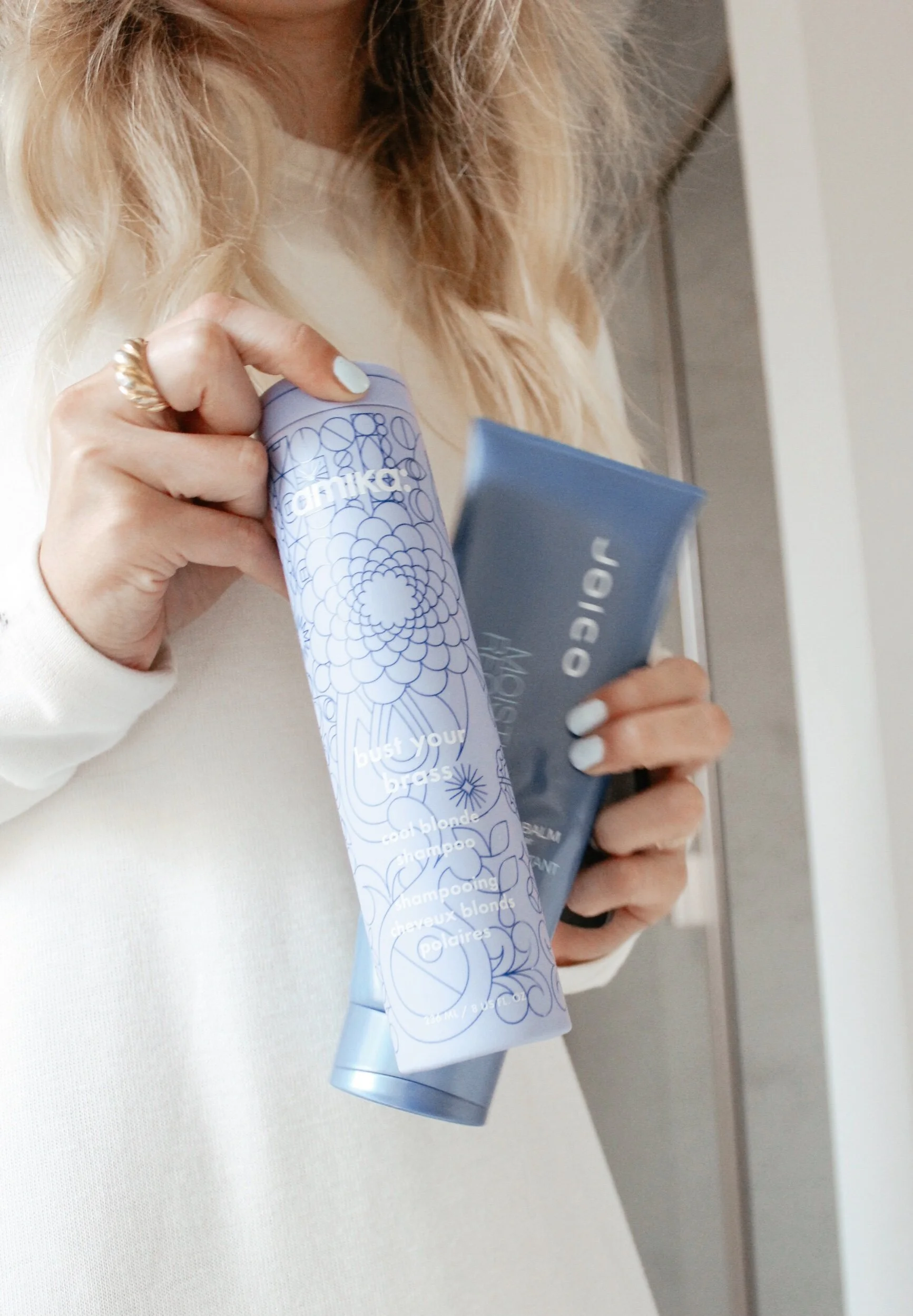 Amika bust your brass, purple shampoo. Love how this tones my hair, getting rid of the brassy hues and leaving behind brighter, blonder hair.